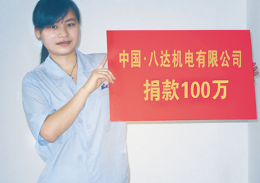 Operating legally, dedicating on public welfare and actively participating in “Cause of Glory” expanding employment and reemployment, helping poor people are as our social responsibility. In 2006 and 2007, Bada has donated more than RMB 1 millon yuan to the Red-cross organization, Huling Town, Armed police, Feiyun Town and Local association of elderly. On May 12, 2008, the entire company donate RMB 200000 yuan to the people suffered the earthquake in Wenchuan.